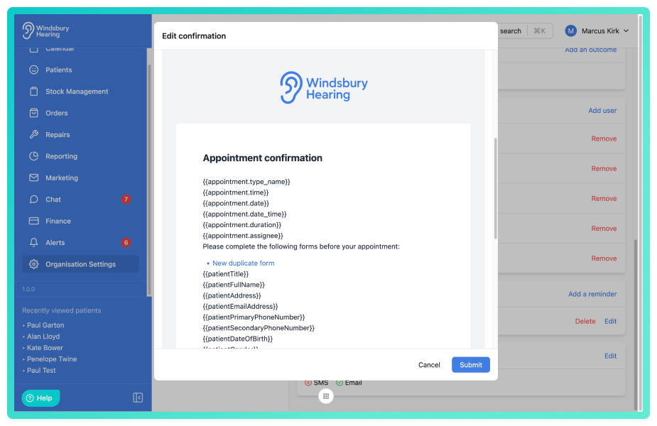 You can automatically send confirmation messages to patients when an appointment is booked, via email or SMS. The content of these message are set with email and SMS templates and can be selected for each appointment.