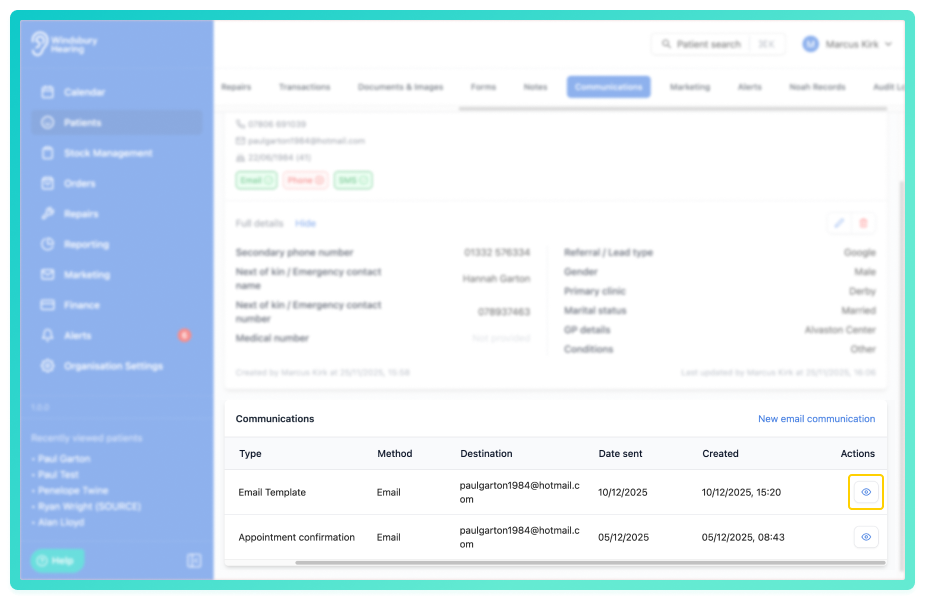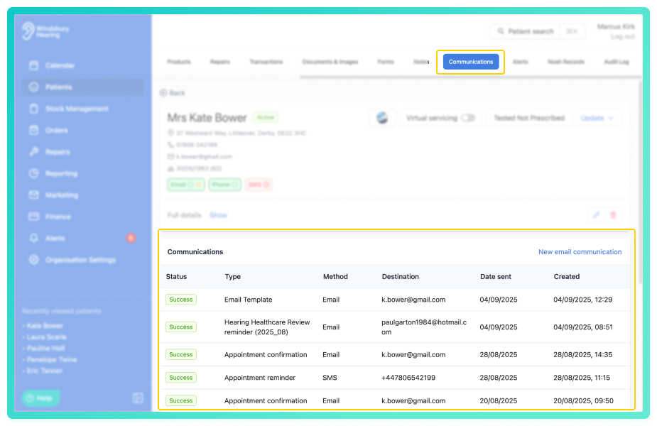 You'll now see a list of communications that have been sent to the patient. This includes: