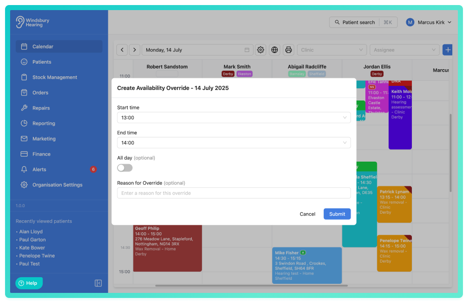 From the calendar, you can add holidays or unavailability to a user's schedule. This can also be managed via organisation settings. From the calendar you change a single instance of a repeating holiday or unavailability. An example would include if you wanted to move a lunch for one specific day