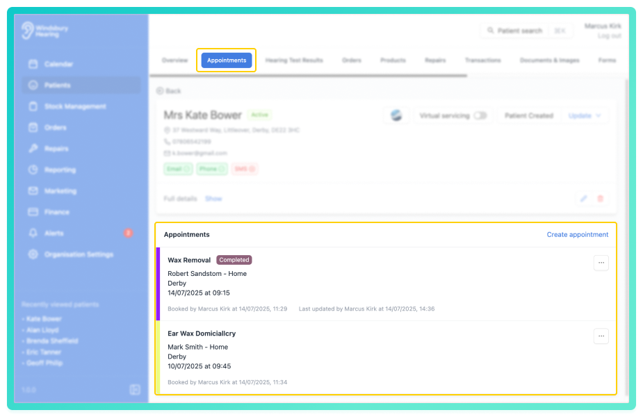 You'll now see a full list of patient's appointments. If there are no appointments listed, you can create a new one.
