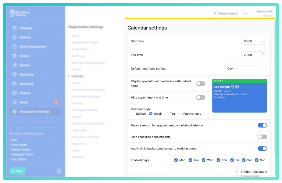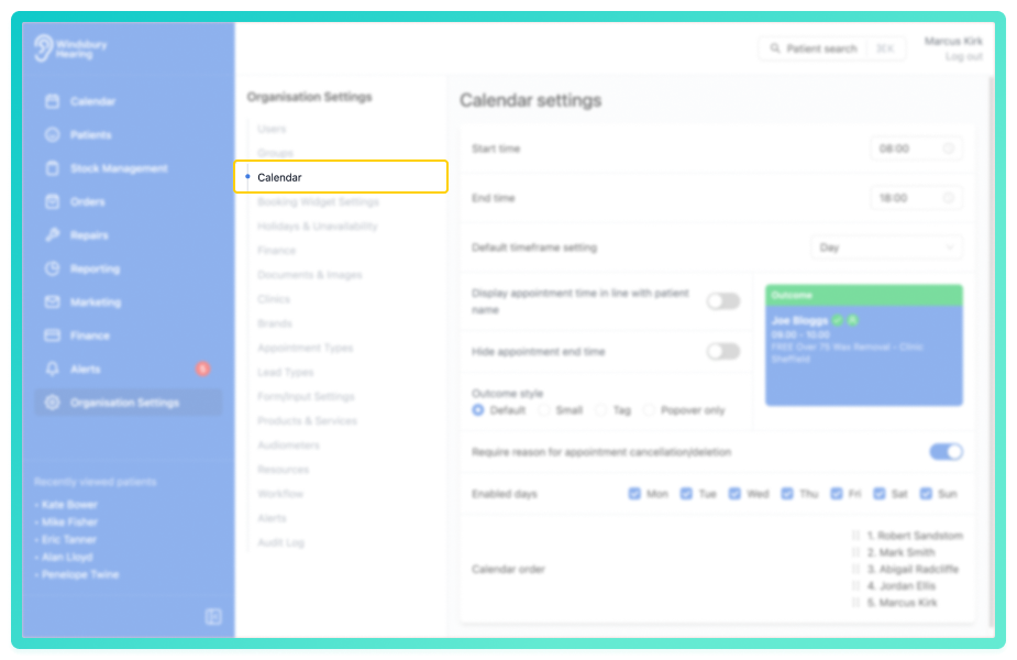 An organisation can hide cancelled appointments from the calendar view for a cleaner look. When this setting is enabled the cancelled appointments will still be viewable on the patient dashboard.