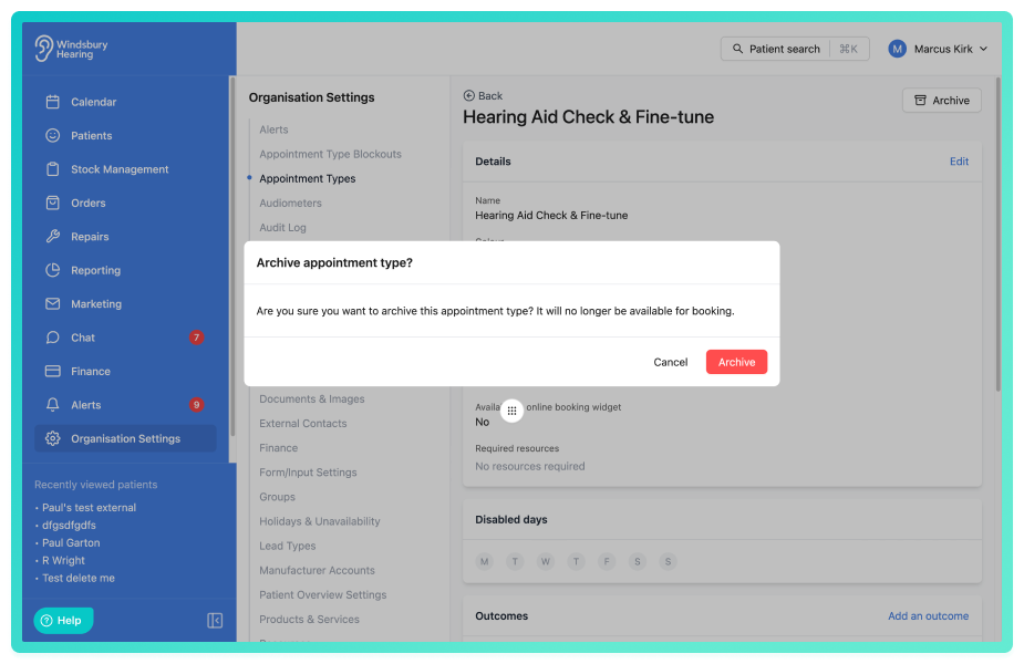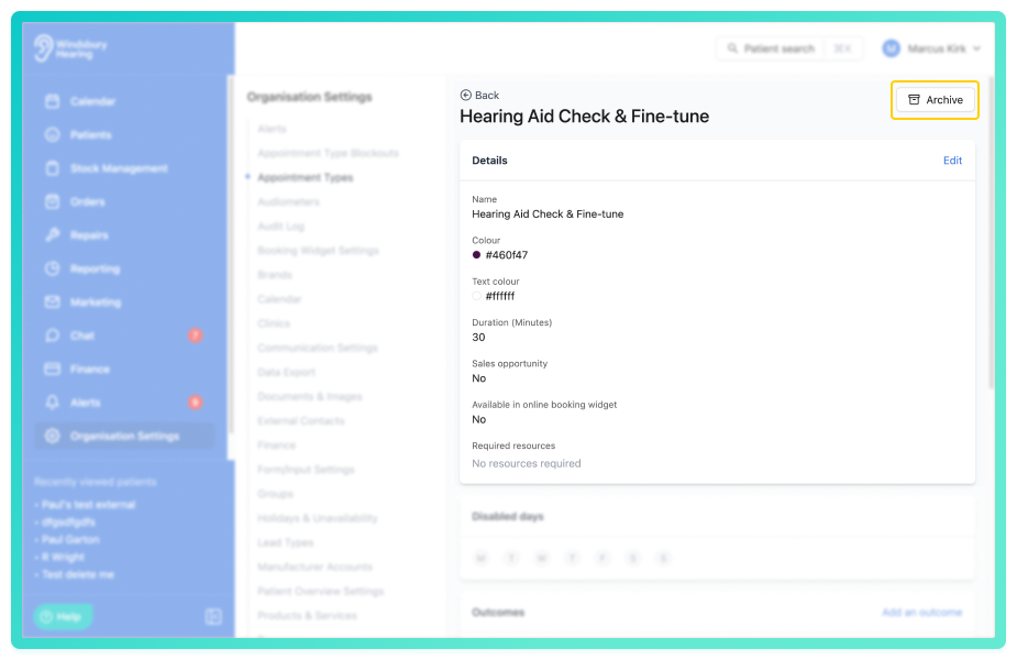 Only users with the correct permissions can archive an appointment type. If you think you should have permission to perform such an action please contact the organisation owner.Archive an appointment type