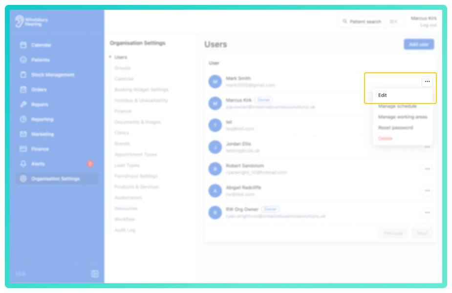 If you need to update a user's information, such as changing their email address, updating assigned clinics, or correcting a name. You can do this in the Users section of the Organisation Settings.