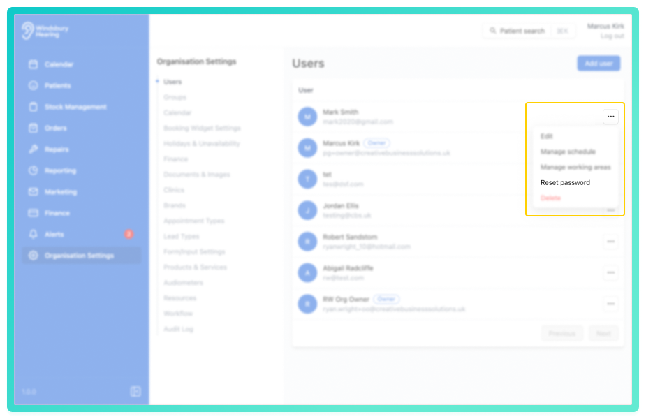 Only organisation owners can reset another user's password.Reset password