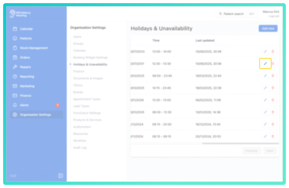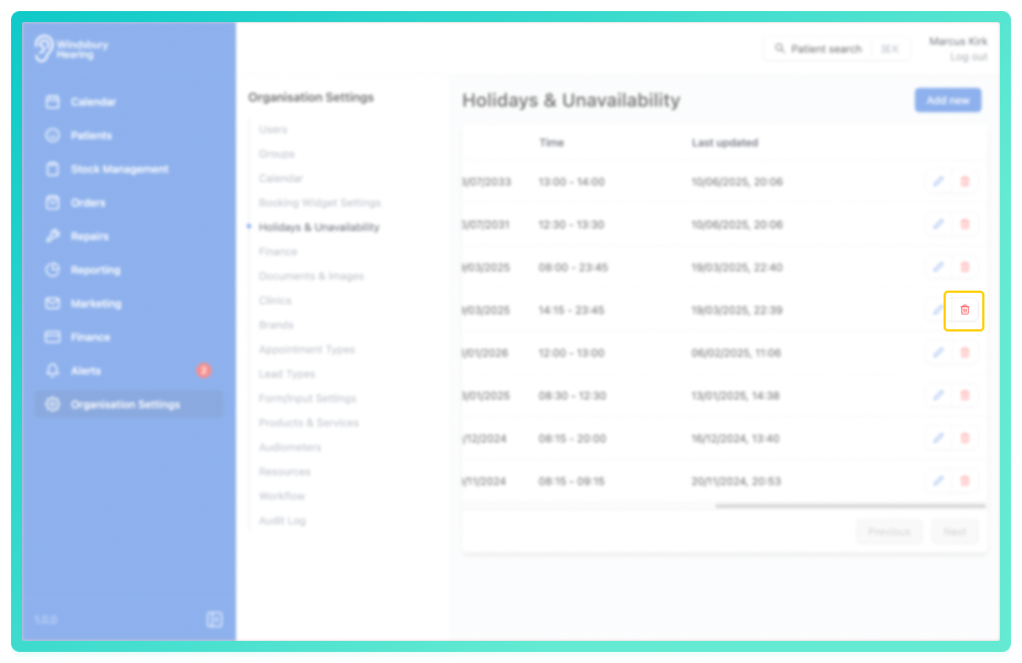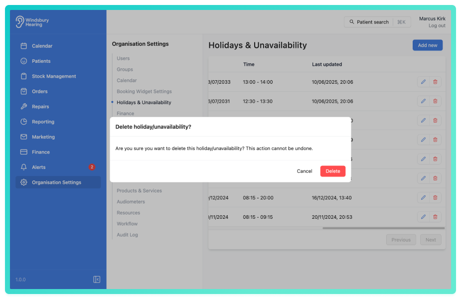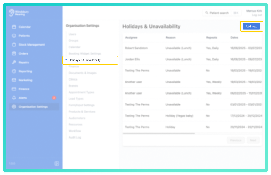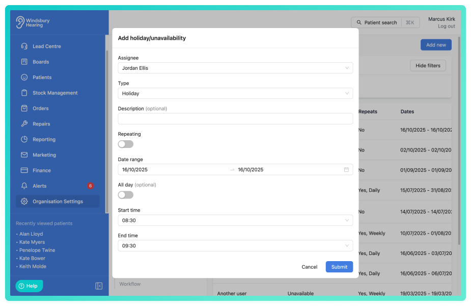 You can manage holidays and user unavailability within the organisation settings. This ensures that calendars reflect when a user is not available for appointments, either temporarily or on a repeating basis.