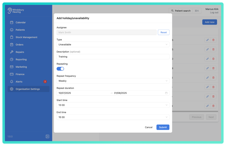 - Click Submit and the HearLink system will apply the unavailability automatically across the chosen time span.