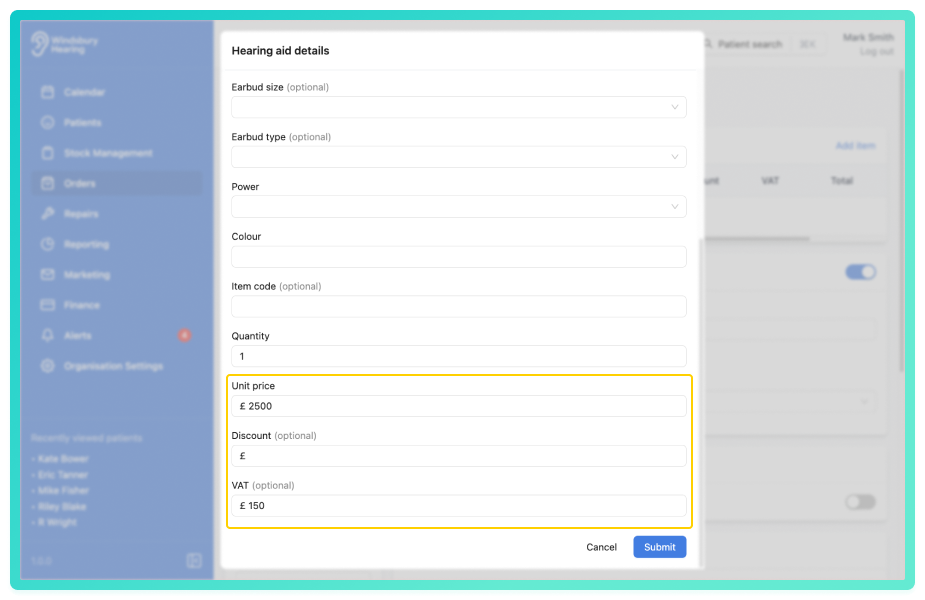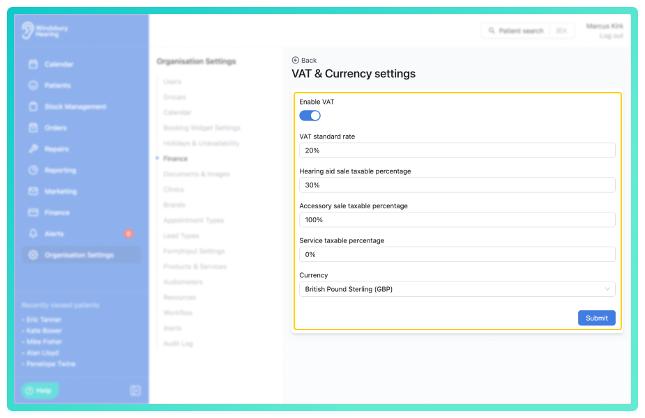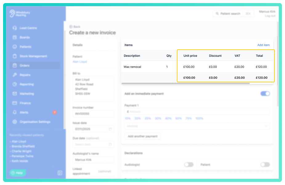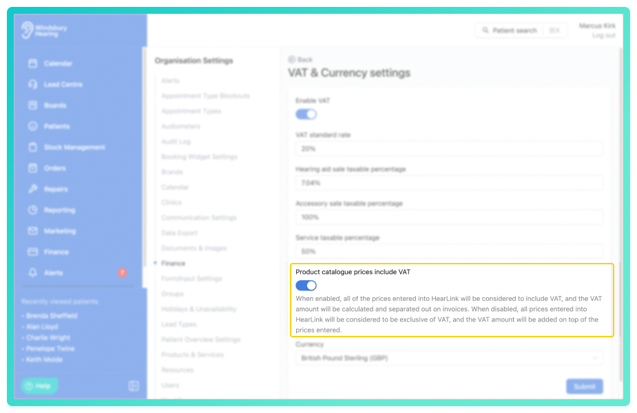 • When enabled, prices entered will be considered VAT inclusive, HearLink calculates and separates the VAT portion automatically on invoices.