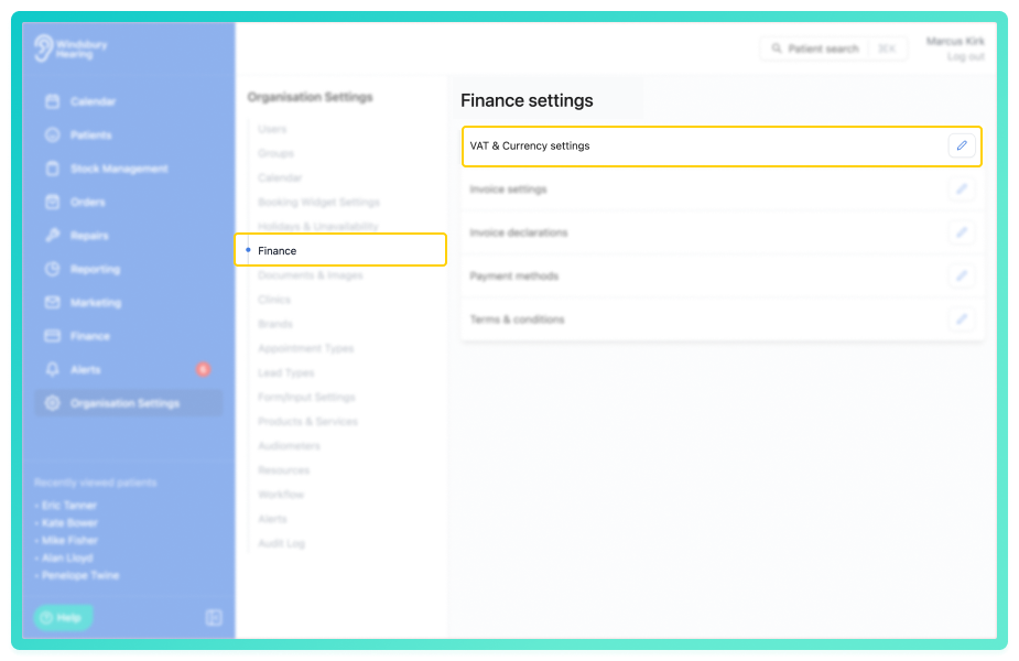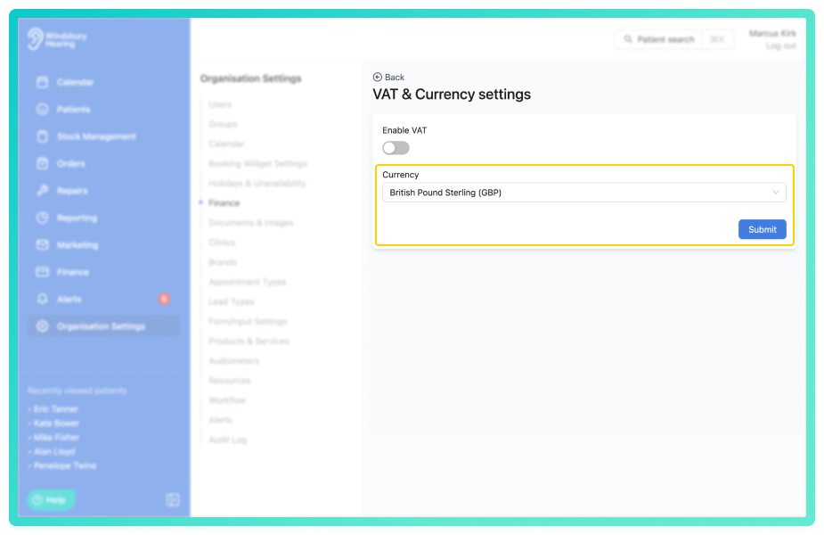 You can customise your organisation's VAT and currency settings to align with your invoicing and regional requirements.