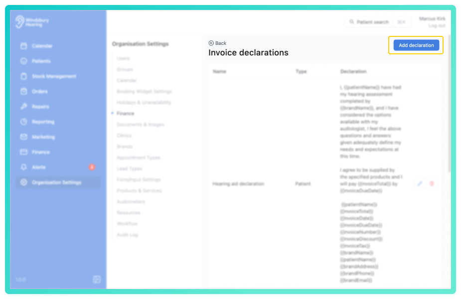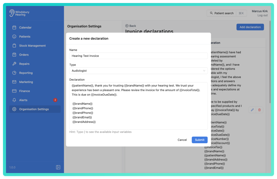 Declarations are used when creating an order, and can be written manually or created as a template created in organisation settings. Declaration templates use variables to automatically pull in relevant data when generating an order. For a deeper understanding of variables, please refer to the dedicated article.