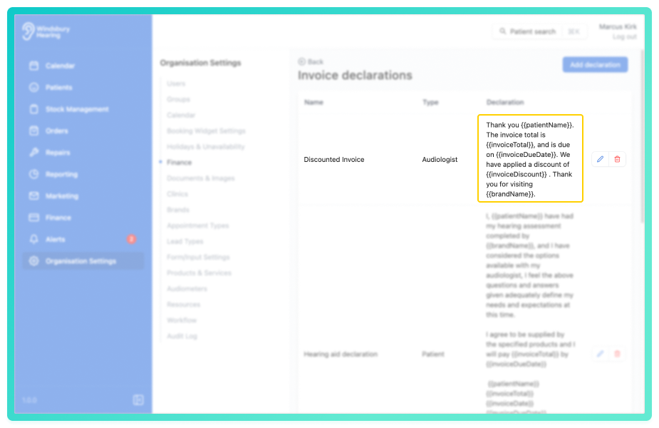 Declaration variables are placeholders within a declaration template that automatically insert specific data when an order is created. For example, a variable could insert the patient’s name, the date, or the audiologist’s details.
