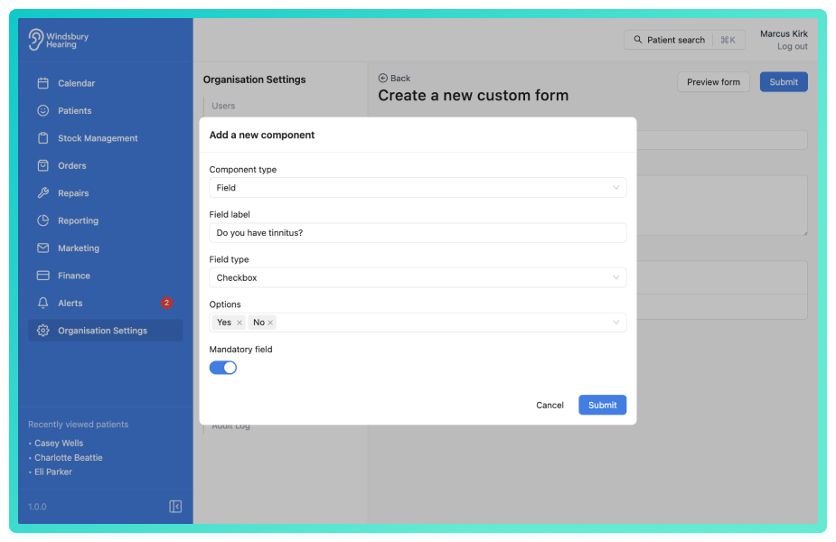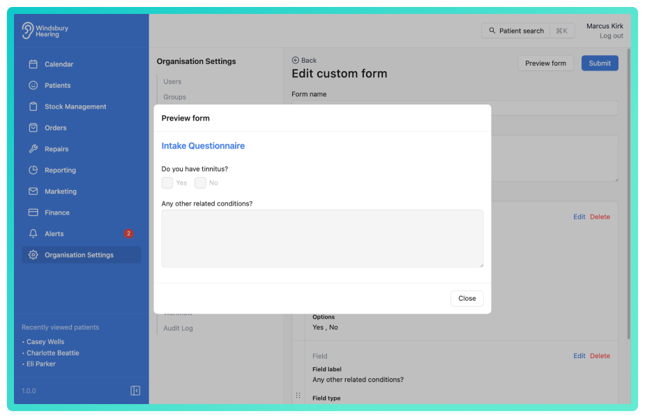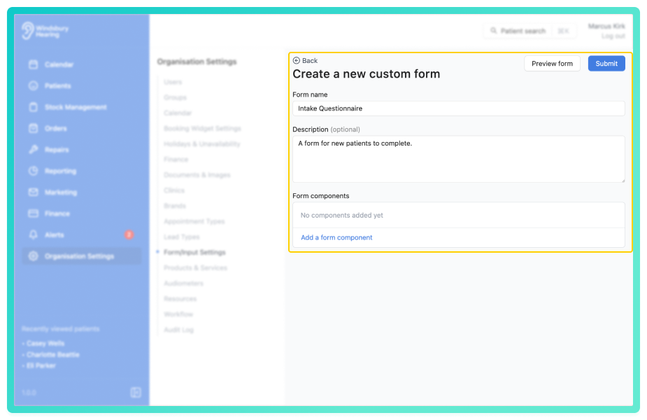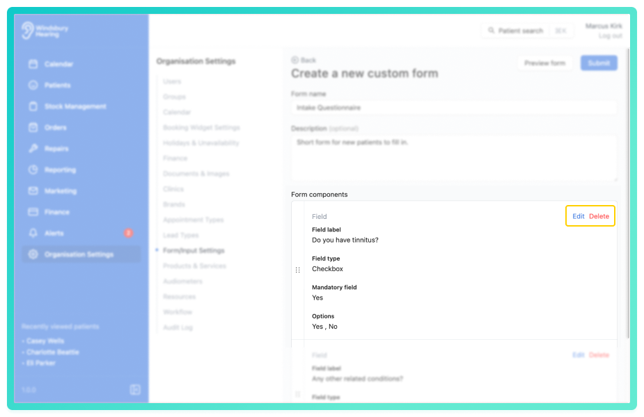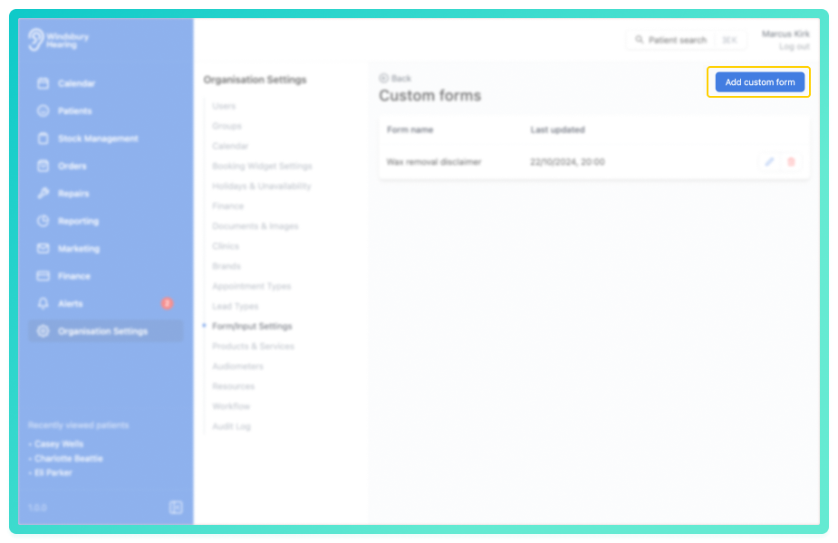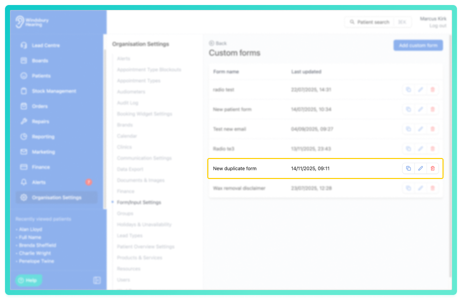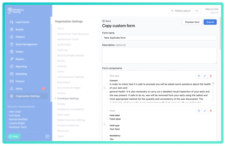 An organisation can create custom forms to digitally collect information from either their patients or for internal use. An organisation can quickly duplicate forms with minor alterations.
