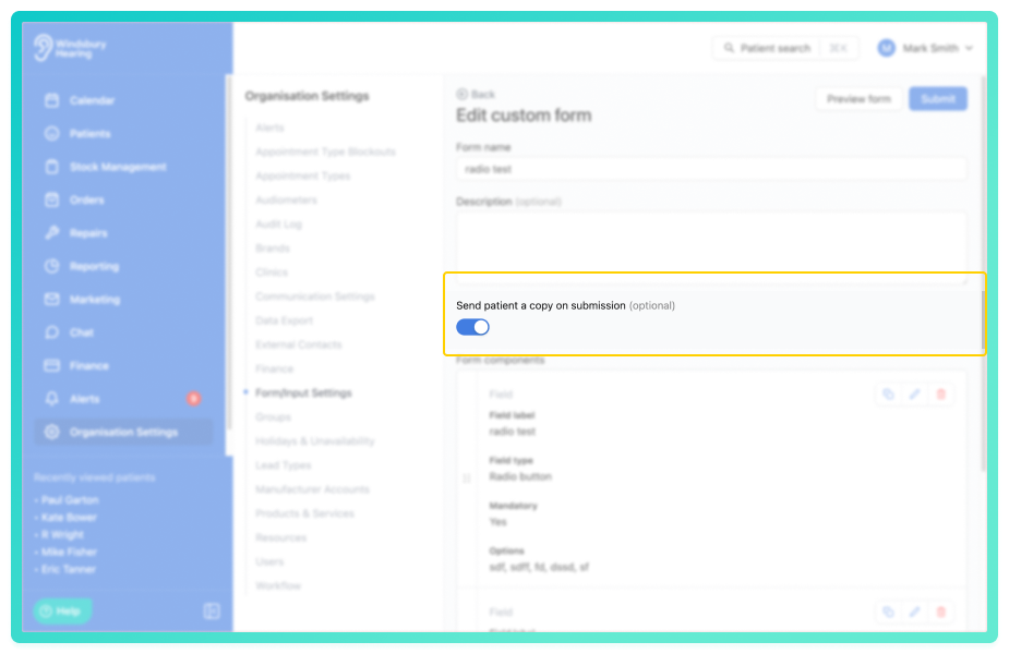 - Enable or disable Send patient a copy on submission.
