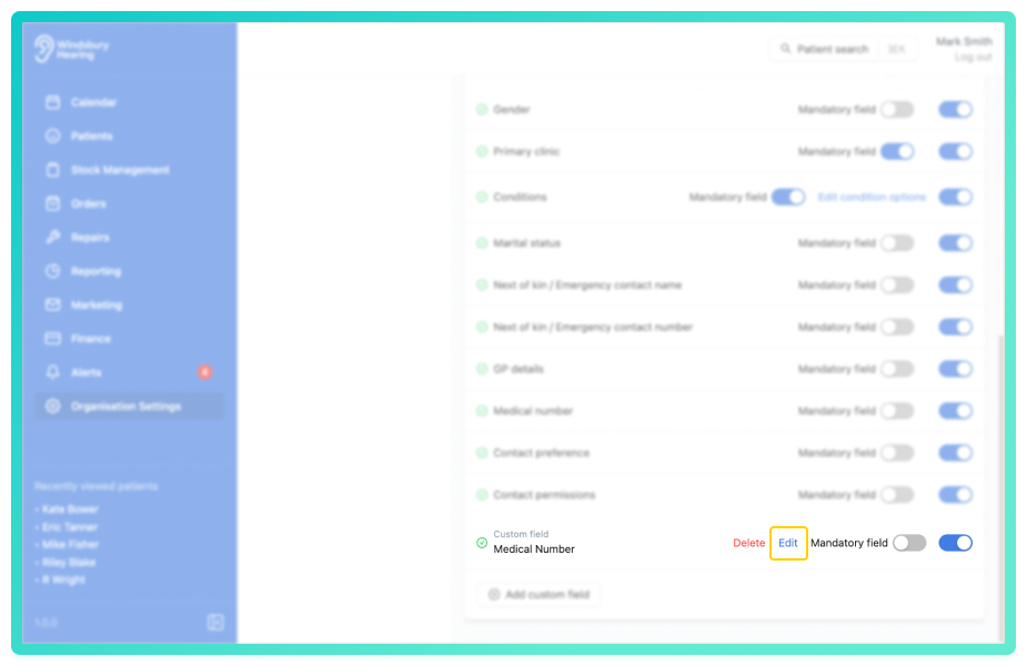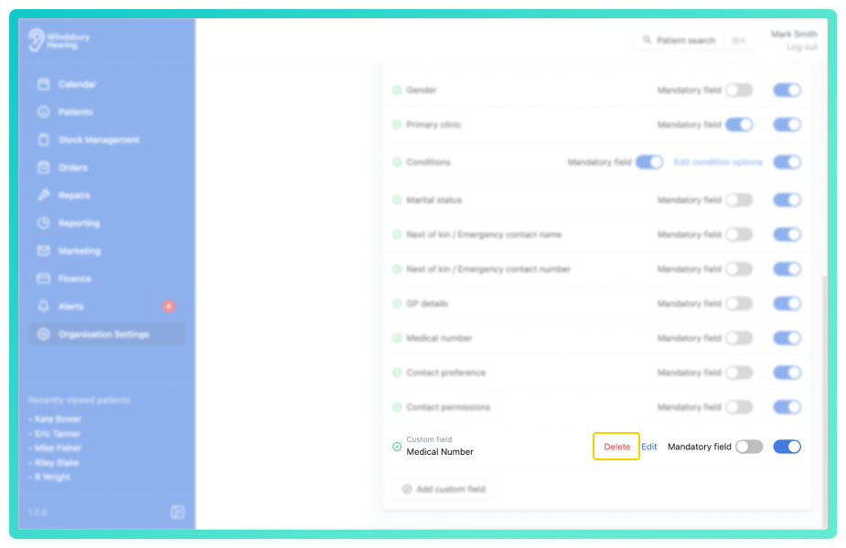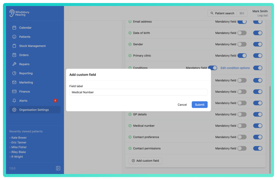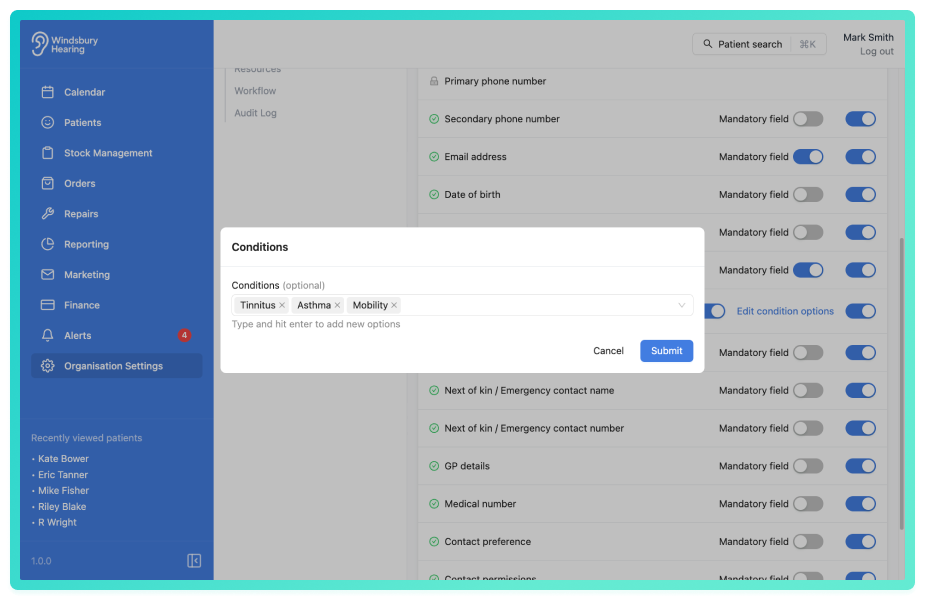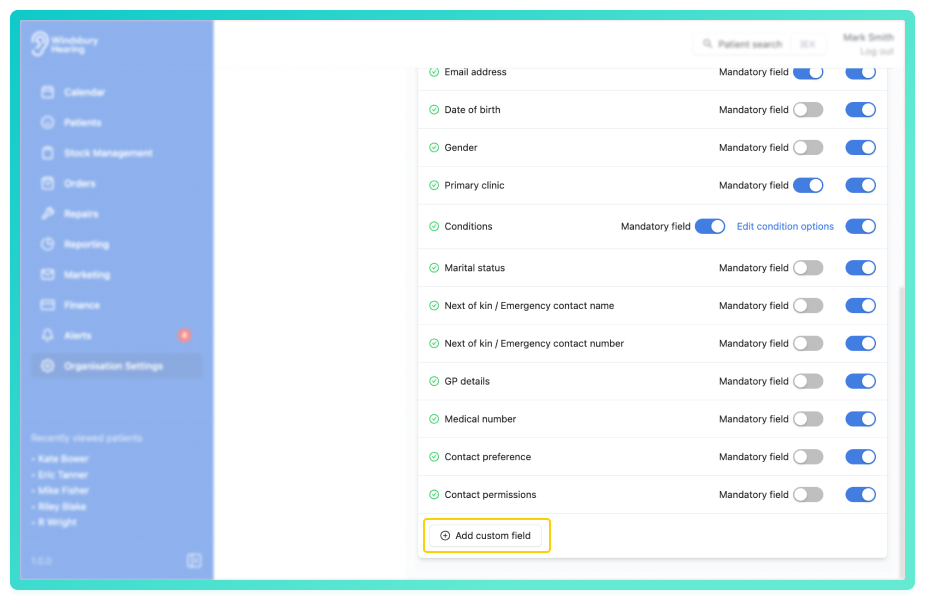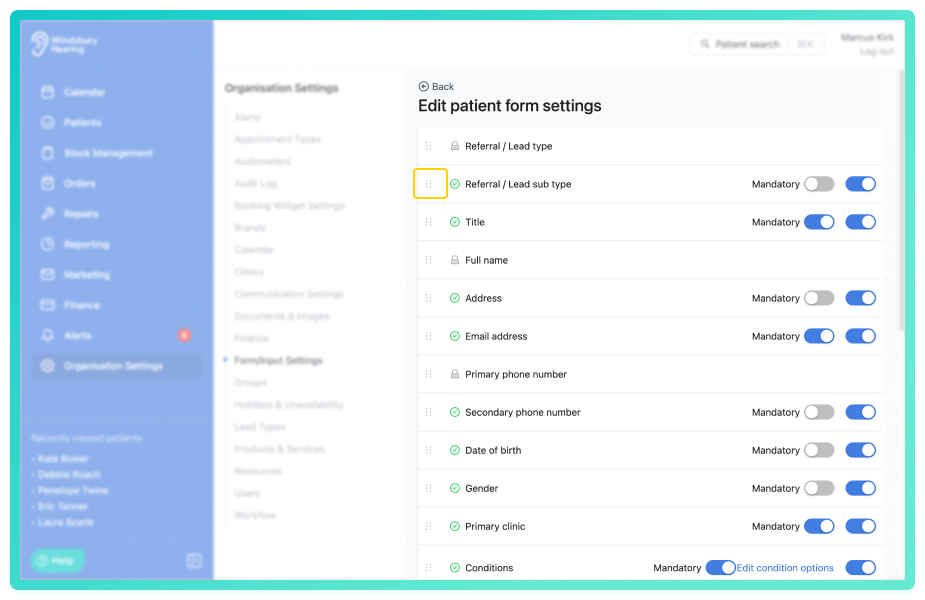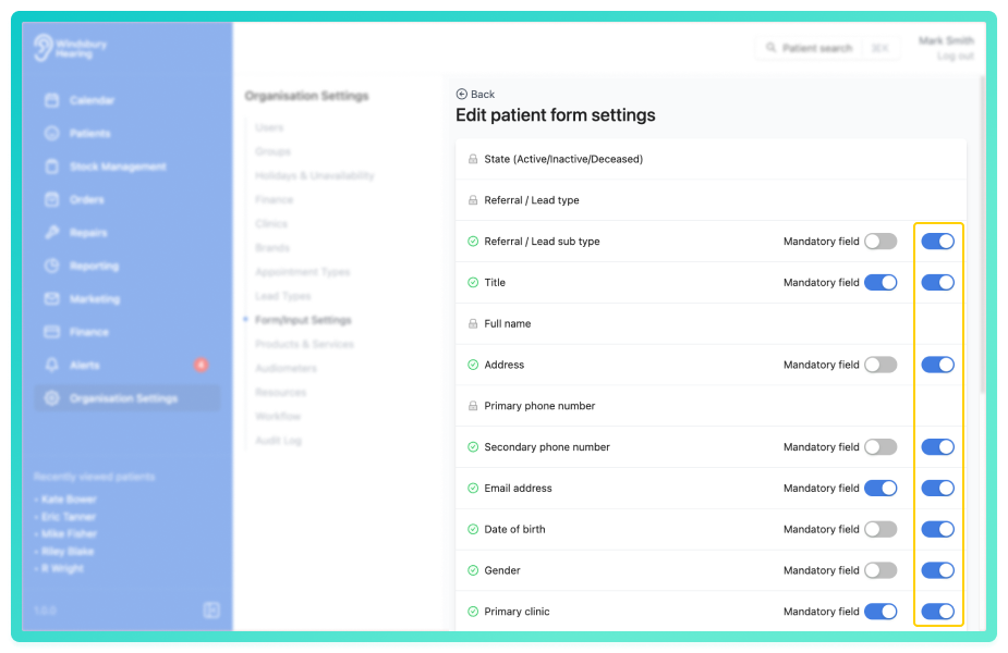All patient form fields can be enabled as mandatory, meaning a patient is required to complete the field, or disabled as optional.