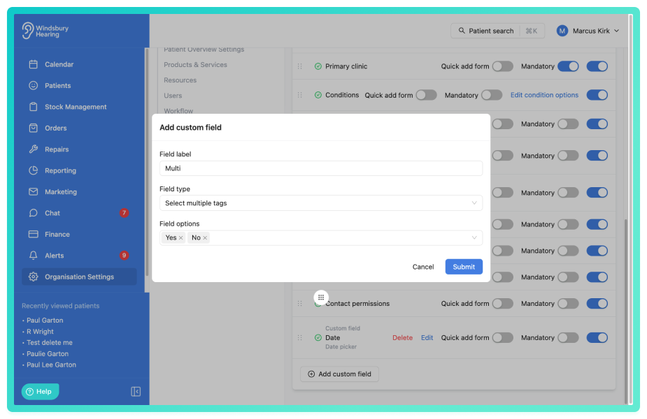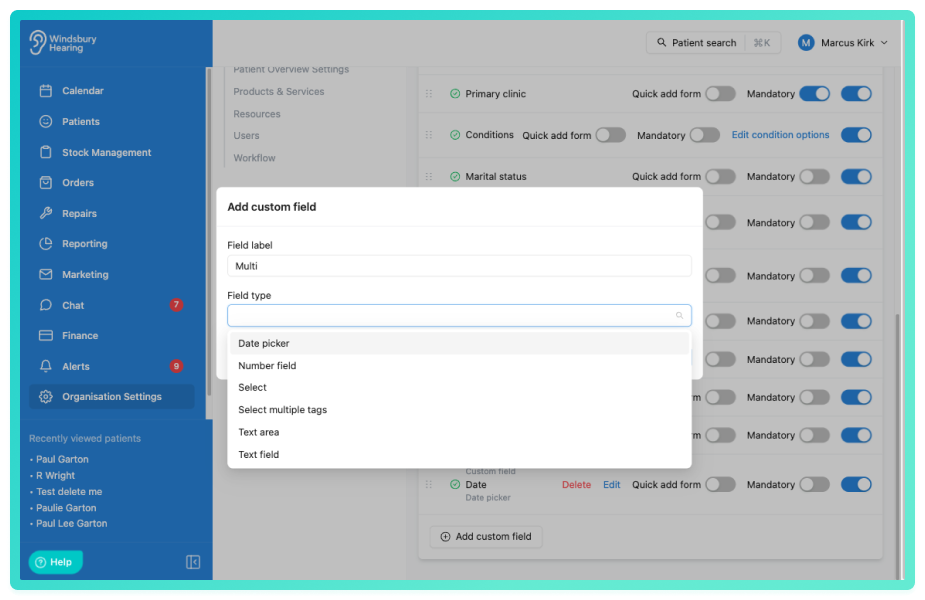 Your organisation can customise the patient form used when adding a new patient. You can choose a number of pre defined fields (such as Gender, Primary Clinic and Title) and enable or disable them as needed, make fields mandatory and set up which fields should appear with the Quick add. You can add your own custom fields with different field types to collect additional patient information.