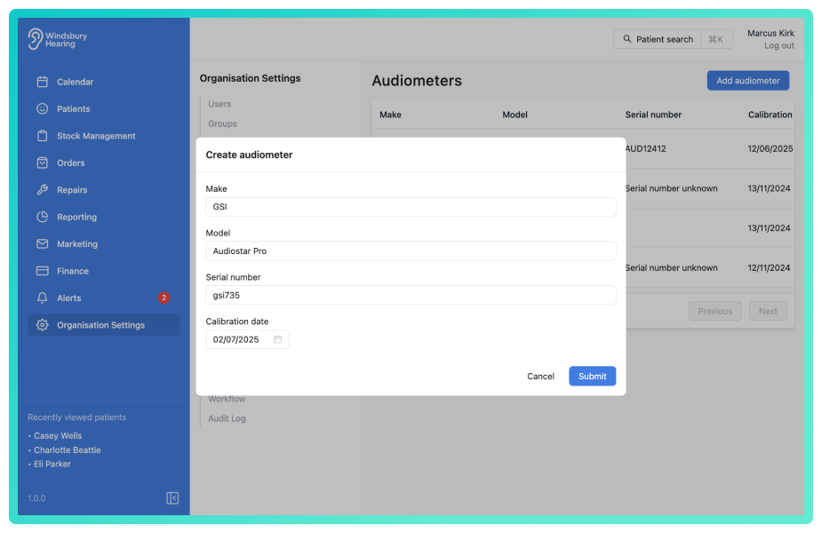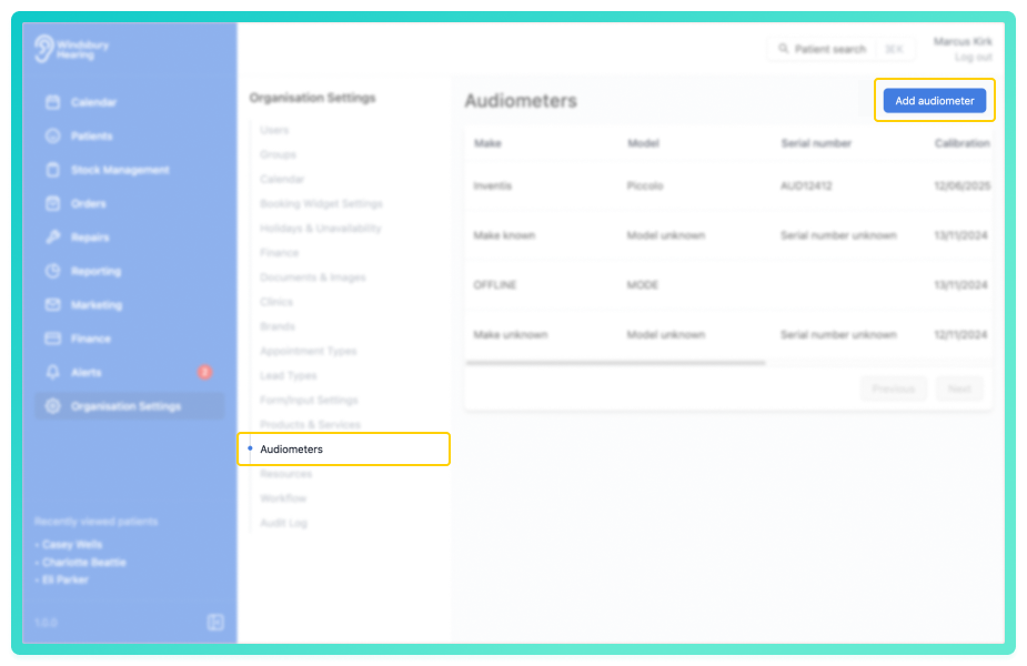 An organisation can have multiple audiometers. You can add all your audiometers, including their calibration dates, to keep your records up to date.