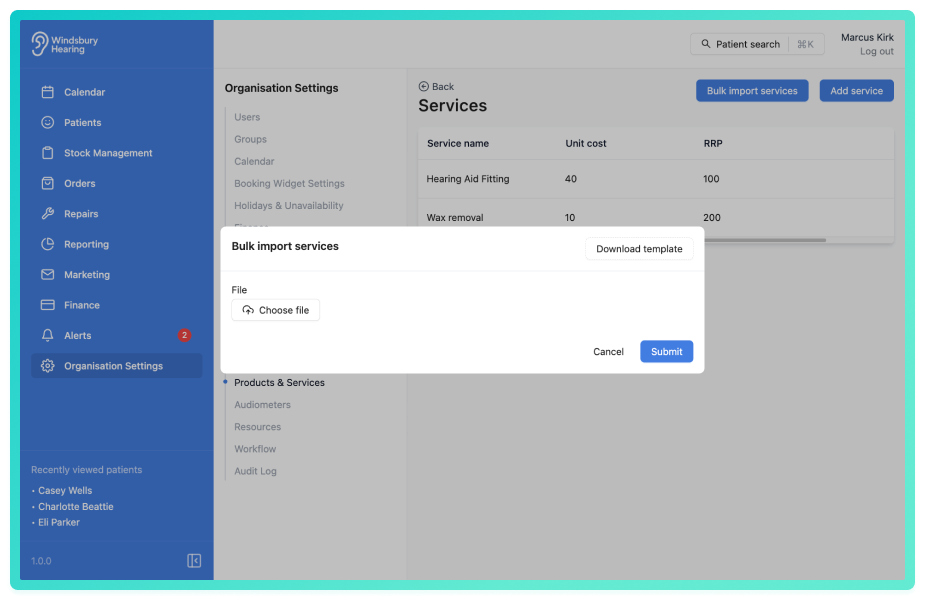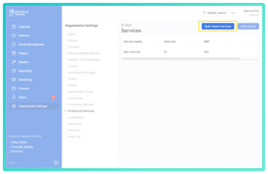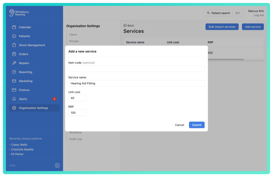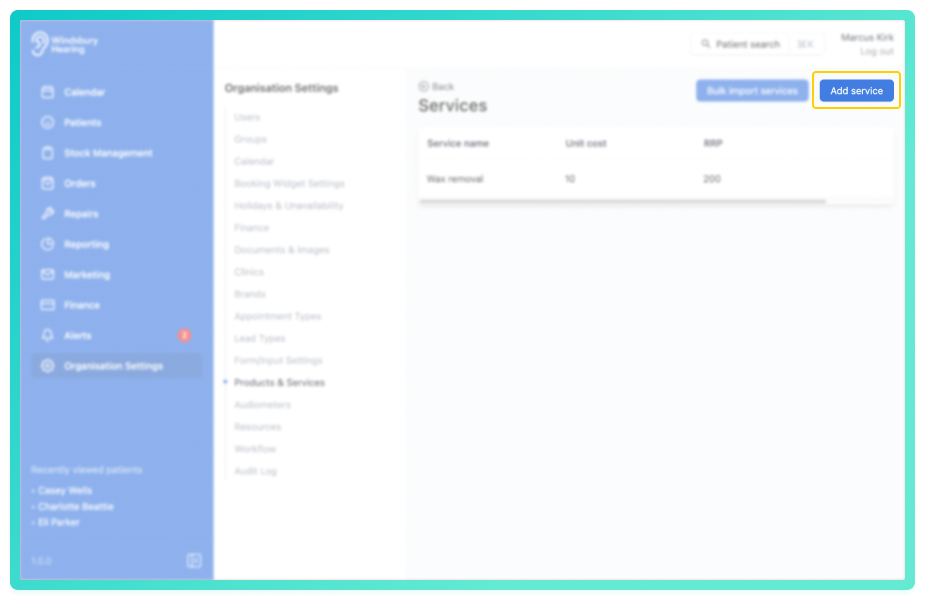 Services can be added to your organisation settings for use when creating an order. You can add a single service manually or bulk import multiple services when first setting up. Once added, services will be available for use when creating an order.