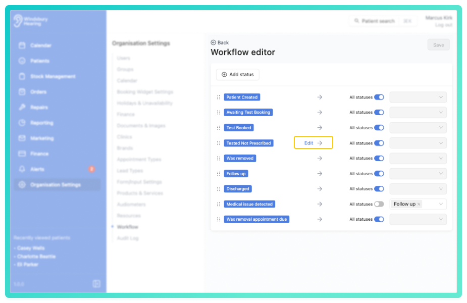 - Hover over the Status you wish to update to locate the Edit text.