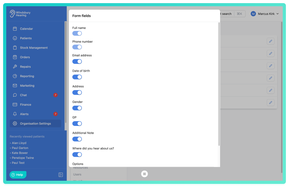 • Enable or disable each Form field as required. Example: Full name and Phone Number enabled (required), Email Address and Where did you hear about us? disabled (hidden).