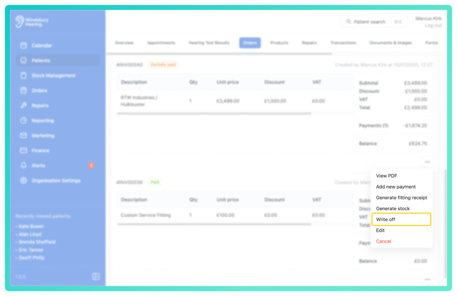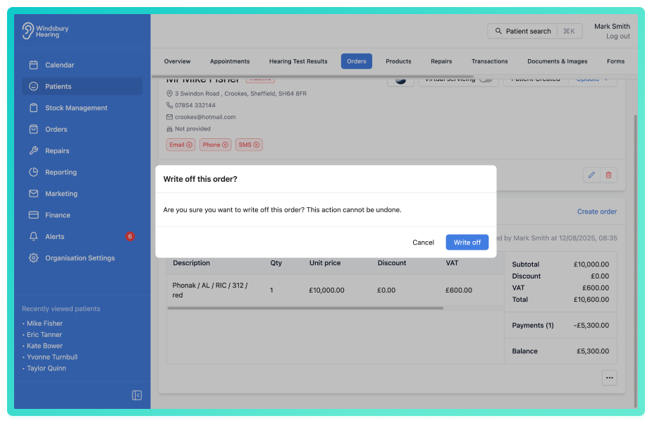 - Click Write off to confirm and write off the order.