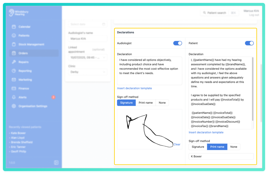 The Invoice declarations section allows you to include optional declarations from both the audiologist and the patient. These declarations appear on the final invoice for sign-off, acknowledgement, or regulatory purposes.