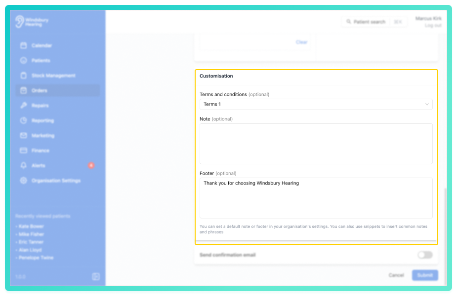 The invoice customisation section allows you to add optional terms and conditions, note and footer to the invoice. These fields are often used for general information, disclaimers, or personalised messages.