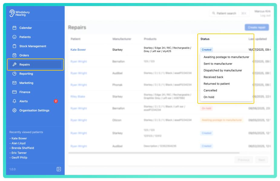 Use this status when the repaired product has been returned to the patient. This removes the repaired product from the repairs list but it will remain visible in the Patient's dashboard.