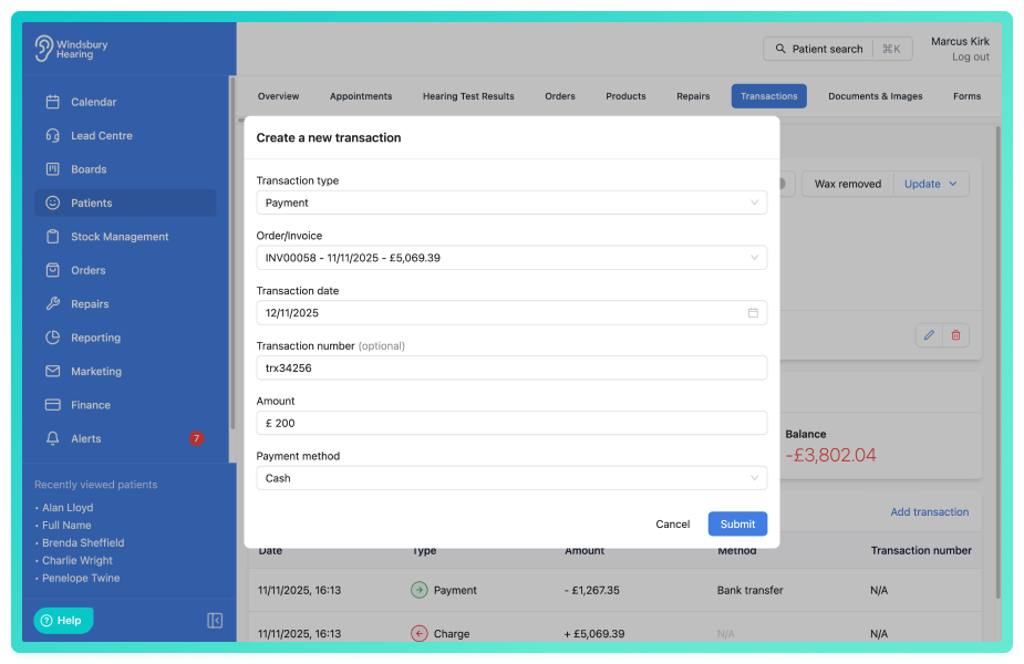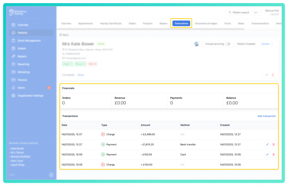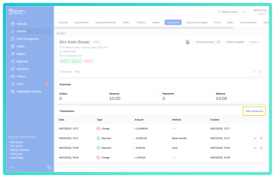 View and add patient transactions directly from the patient dashboard. You can also add refunds in this section. For a broader overview of transaction and finance settings, see this article.