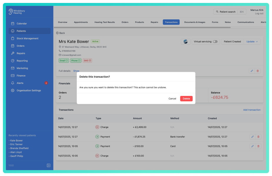 If a transaction type is Charge, you cannot edit or delete it. These are locked by the HearLink system to preserve financial accuracy.Edit a transaction