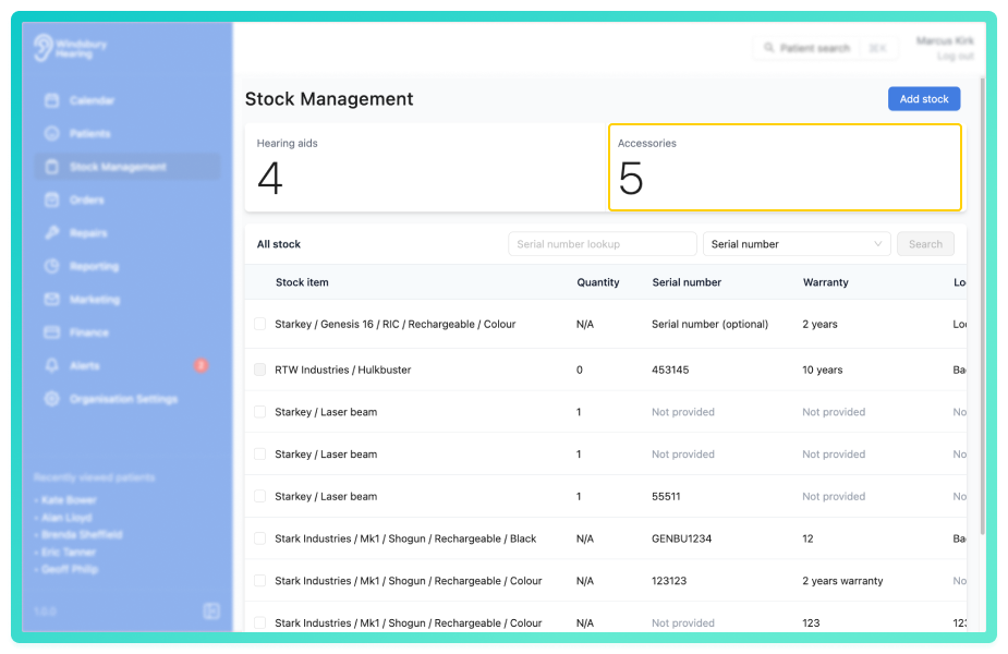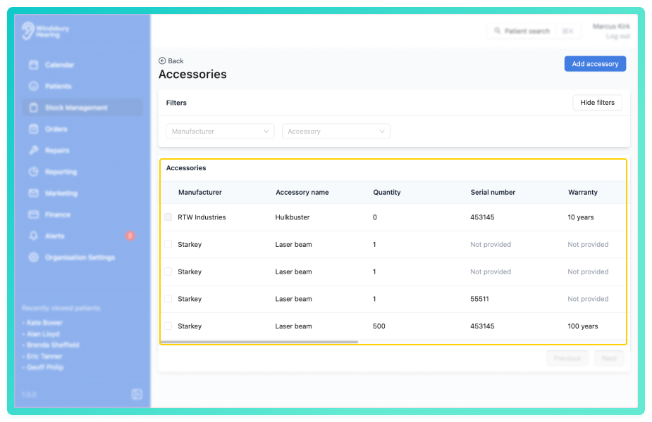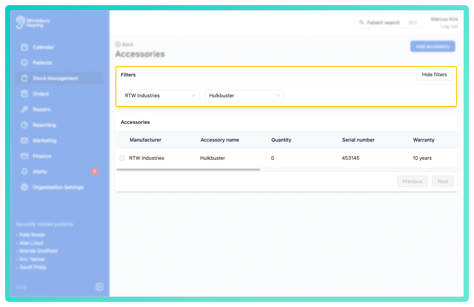 In stock management, you can choose to view accessories only. rather than both hearing aids and accessories. You can also filter by manufacturer or accessory type to refine the list further.