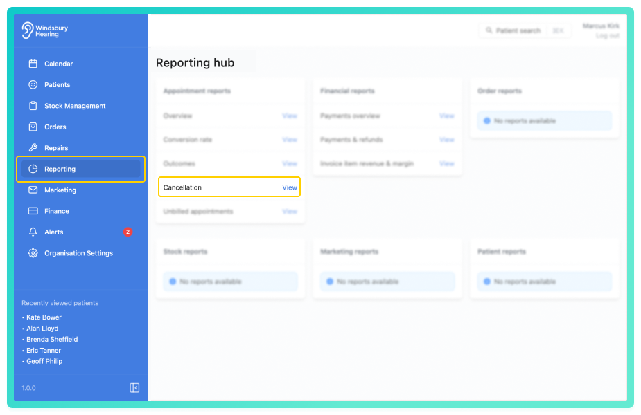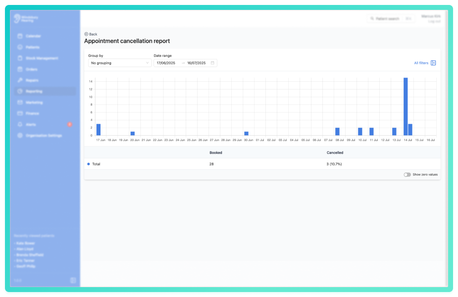 Track how many appointments are being cancelled, and explore trends based on referral source, appointment type, or clinic.