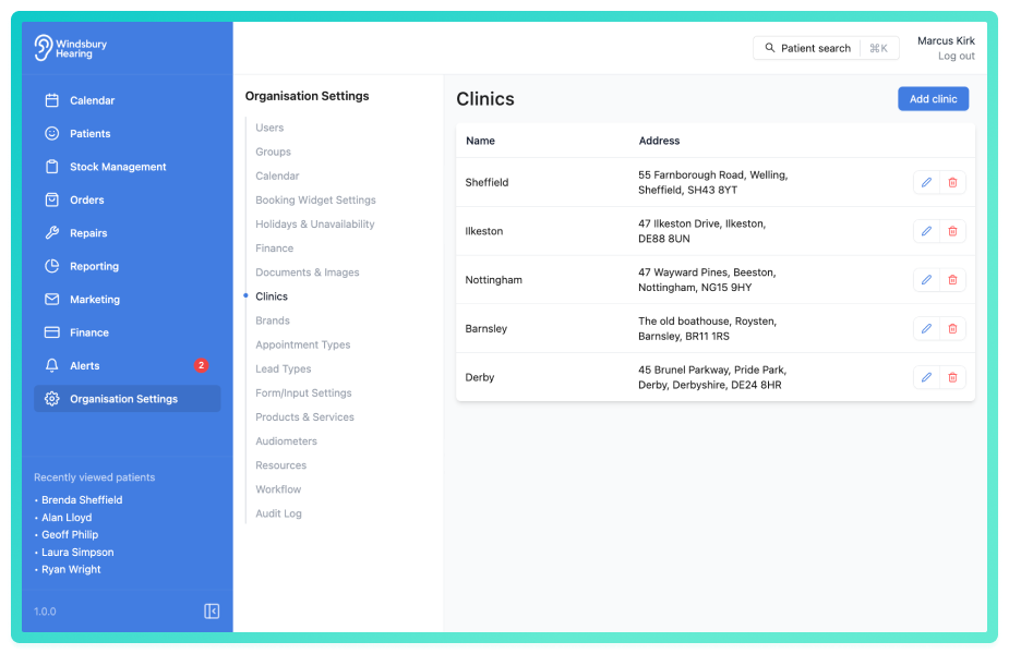 Clinics represent the physical locations where your organisation operates. You can manage one or multiple clinics depending on your setup. Each clinic can have its own name, address, contact details, and be associated with specific brands.