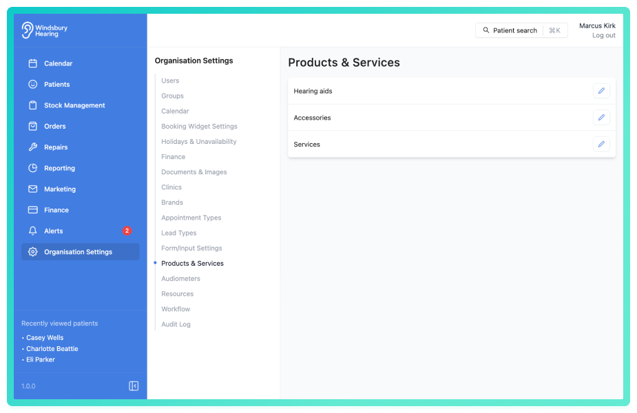 The Products & Services section in Organisation Settings allows you to manage the items and services used throughout the HearLink system, such as when creating orders or managing stock. This includes hearing aids, accessories, and services.