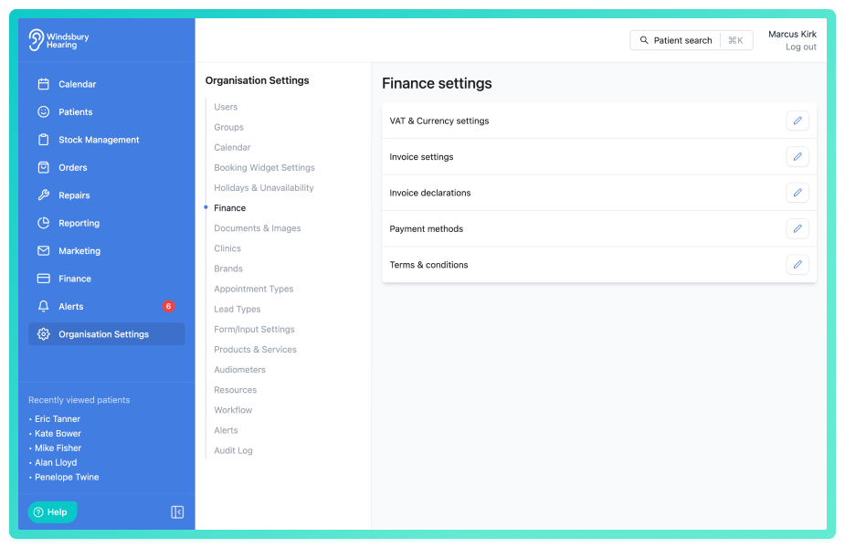 The Finance section of Organisation Settings allows you to configure the key financial components used across your HearLink account. From VAT settings to invoice details and payment methods, this section ensures your financial documentation aligns with your organisational and regulatory requirements.