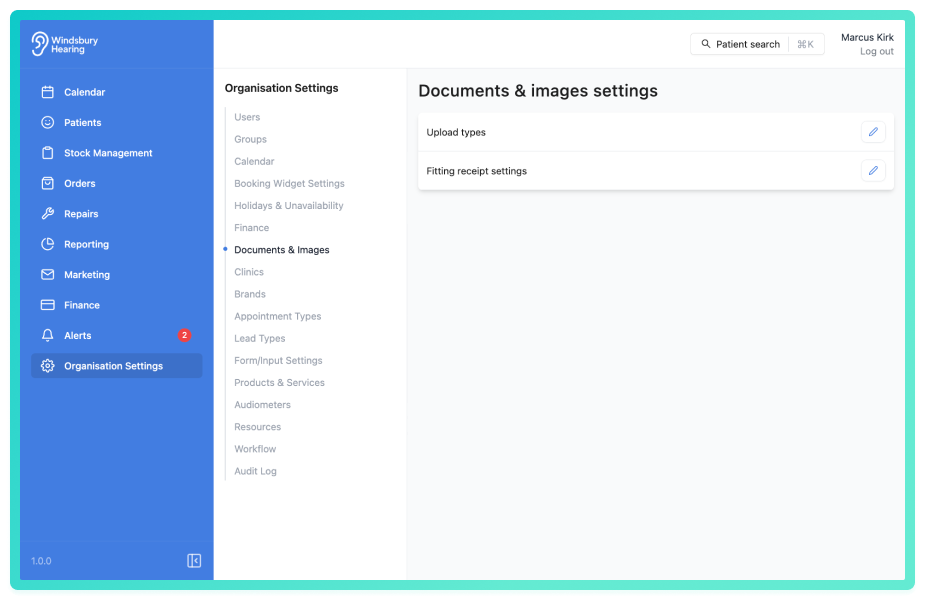 The Documents & Images section of Organisation Settings lets you manage how files are uploaded and stored across the HearLink system. This includes the ability to define custom upload types and configure fitting receipt settings, helping keep your file management structured aligned with your organisation’s needs.