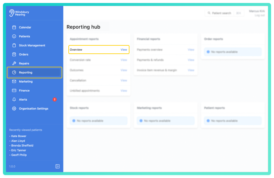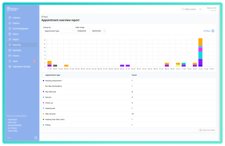 The overview report is useful for seeing overall appointment volumes and understanding trends across teams, locations, and referral sources.