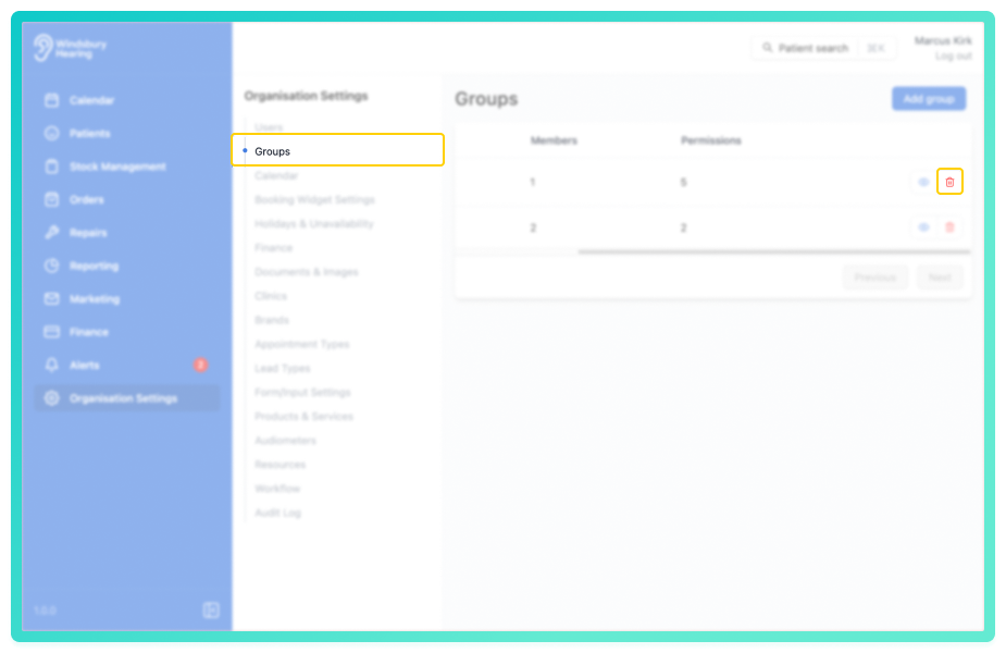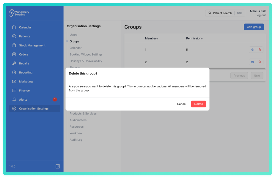 Click Delete to confirm and delete the group.