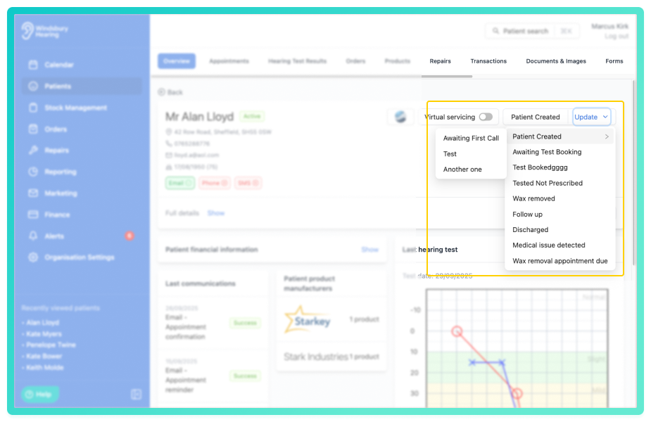 Patient statuses help track a patient's position within your workflow. Whether they're a new lead, in consultation, fitted, or discharged. Updating a patient's status not only helps your team stay aligned, but may also trigger appointment outcomes if linked.