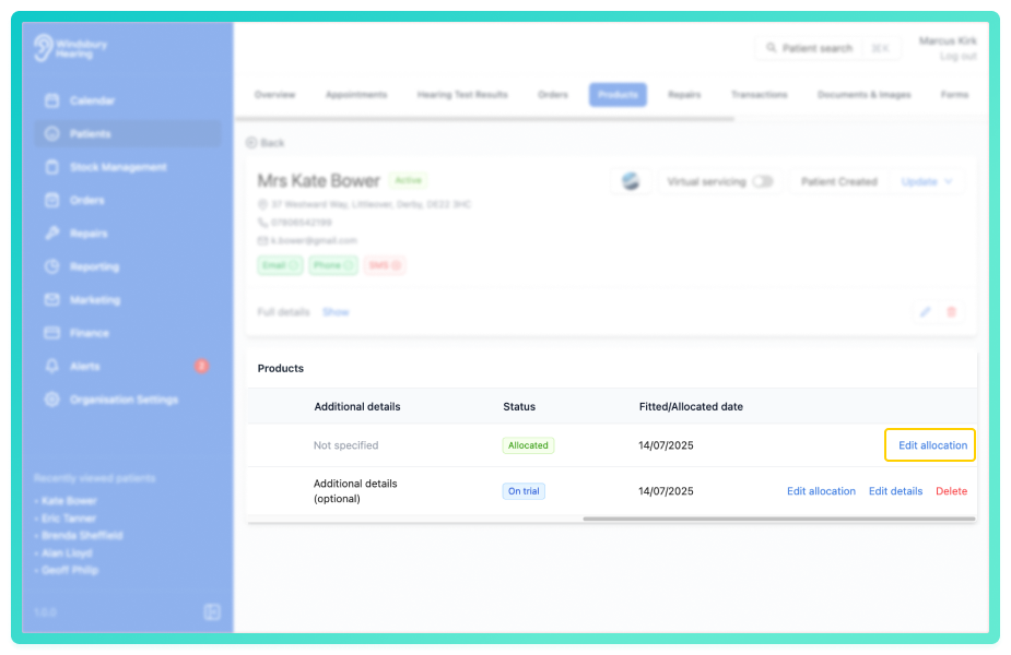 Occasionally, product allocation details may need to be updated. For example, changing the fitting date or updating which ear a hearing aid was assigned to.