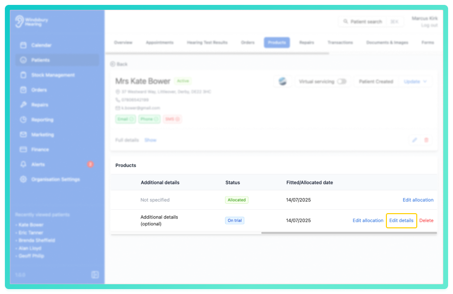 You may need to update the details of a product that has been allocated to a patient. Such as adjusting the serial number, warranty information, and more.
