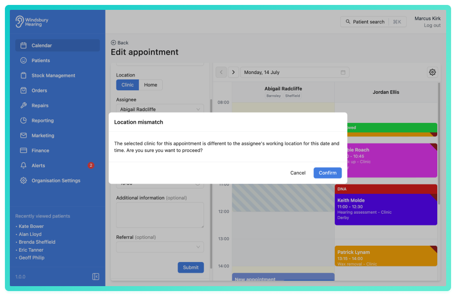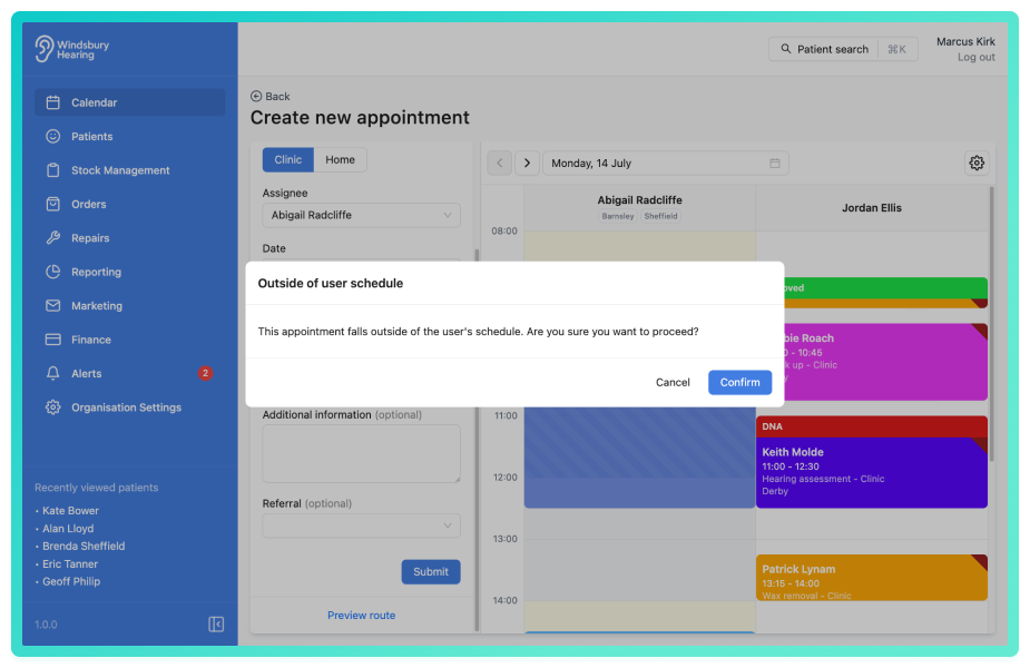 When booking an appointment from the calendar view, you may encounter different warning messages such as, location mismatch or non working day.