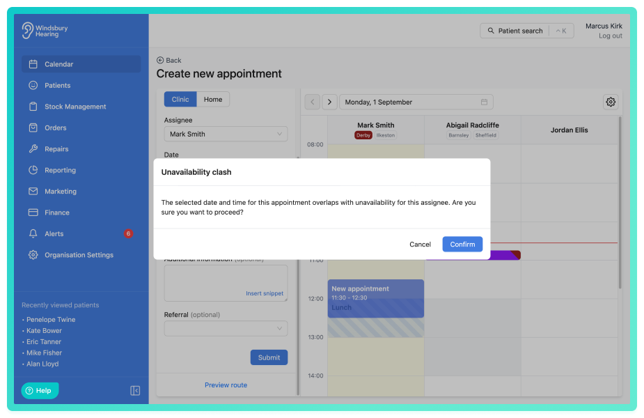 - Booking an appointment for Robert during this time would trigger the Unavailability clash warning.