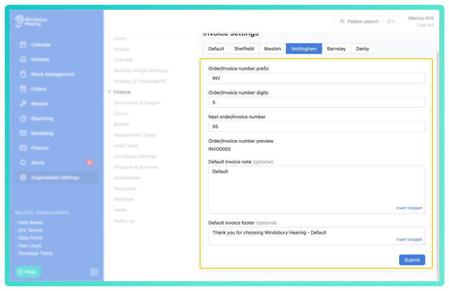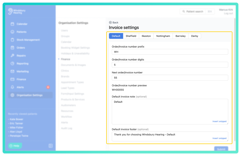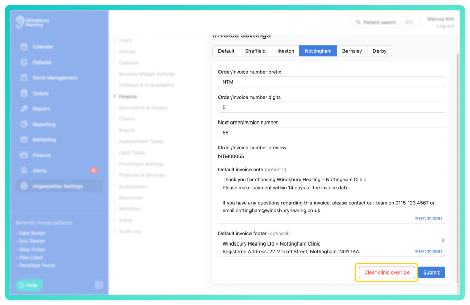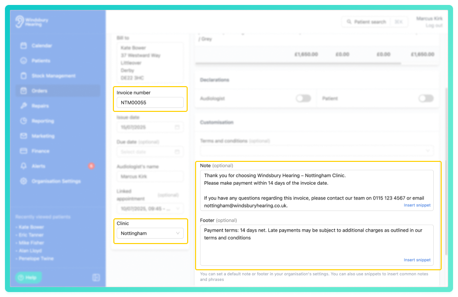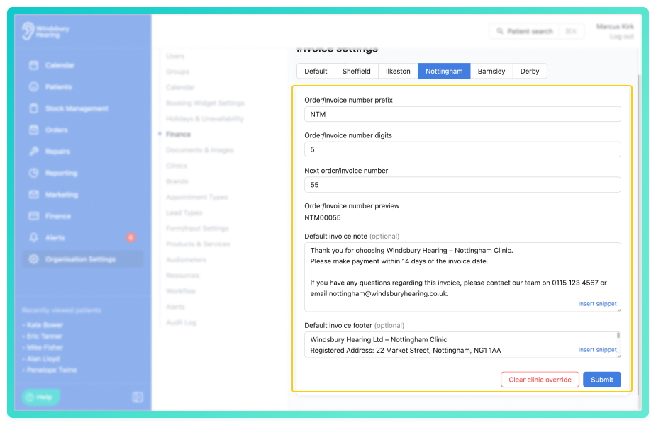 Example: Windsbury Hearing operates multiple clinics. For the Nottingham clinic, they use invoice prefix will be NTM and include clinic specific payment instruction in the note and footer.