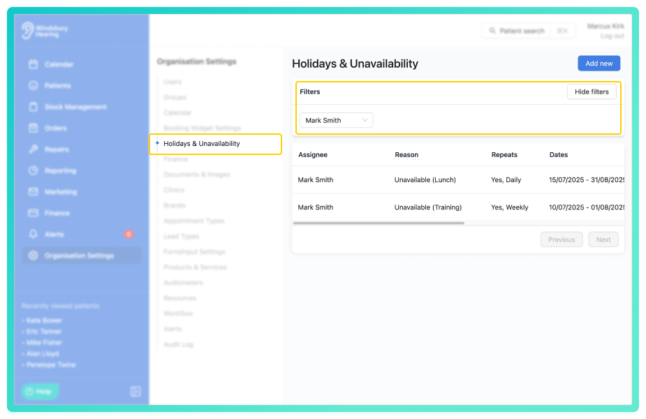 In the Holidays & Unavailability section of the Organisation Settings, you can now filter all the holidays or unavailability per user.