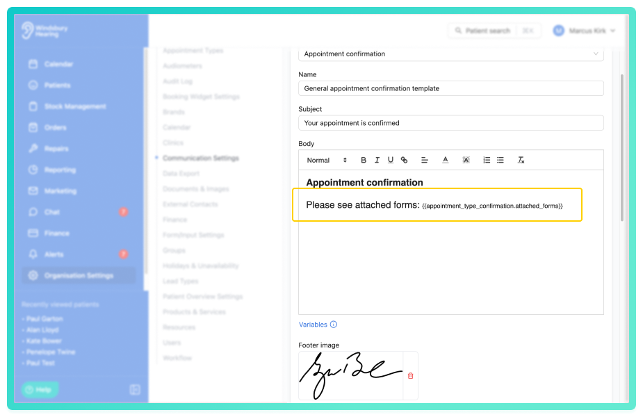 Multiple documents can be attached to any email template. These are then sent with the template when emailing the patient.