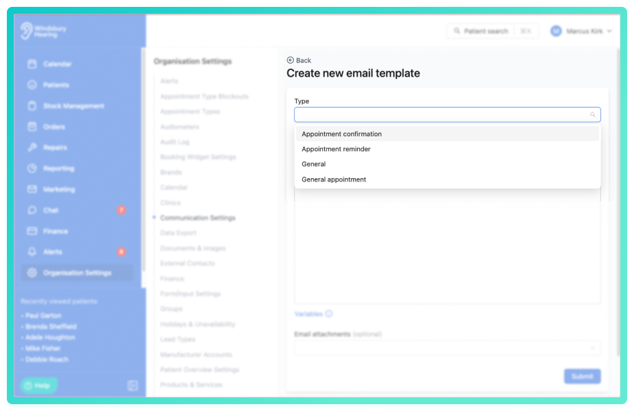 • General templates are selected when sending ad hoc emails from the Communications section of the patient dashboard.