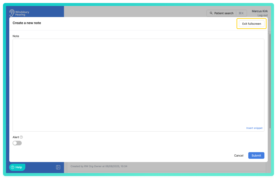 When creating a note for a patient, a user may want the dialog box fullscreen. You can do this by toggling the new Fullscreen button in the top right hand corner.