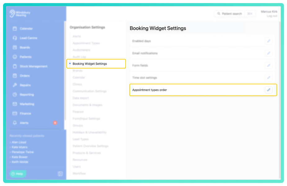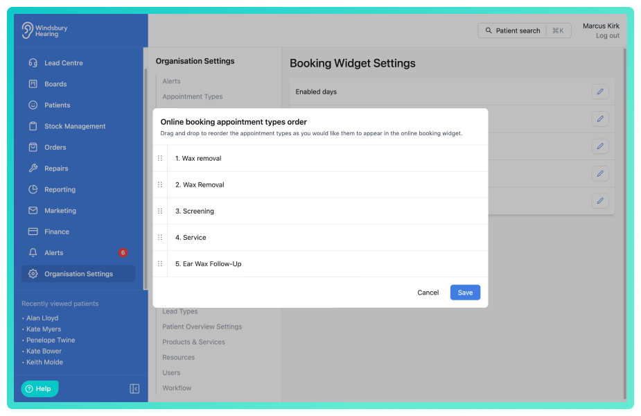 Only users with the correct permissions can order appointment types. If you think you should have permission to perform such an action please contact the organisation owner.