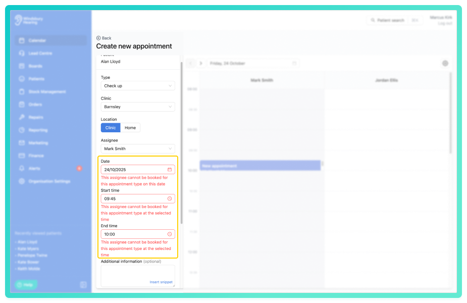 Appointment type blockouts allow you to temporarily prevent specific appointment types being booked for certain users. This affects both online and within the calendar. You can create these within the organisation settings under the new section Appointment Type Blockouts.