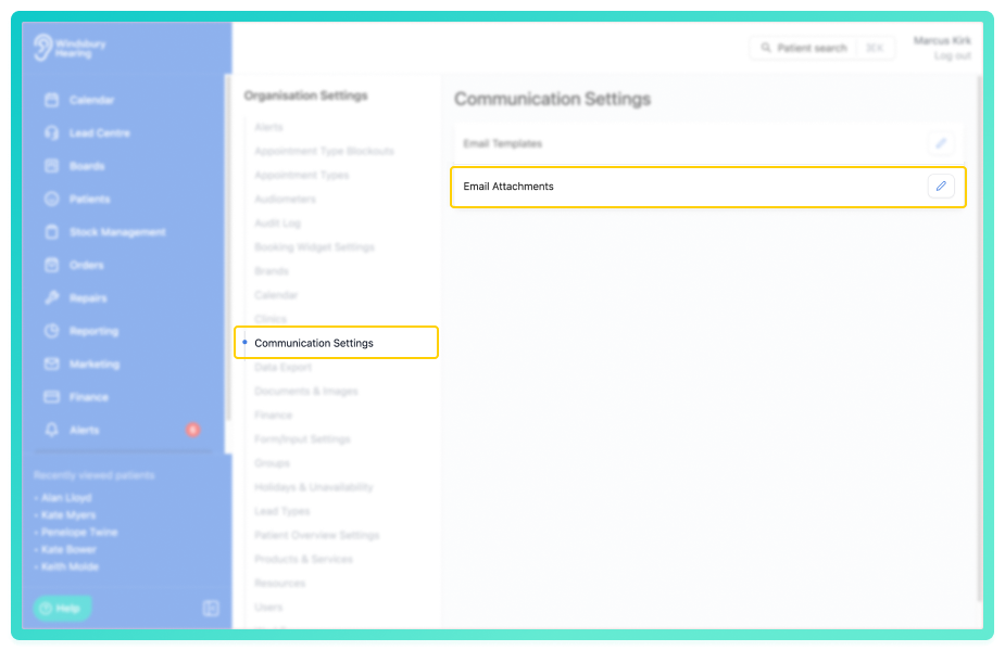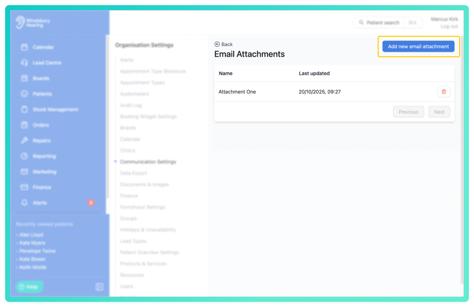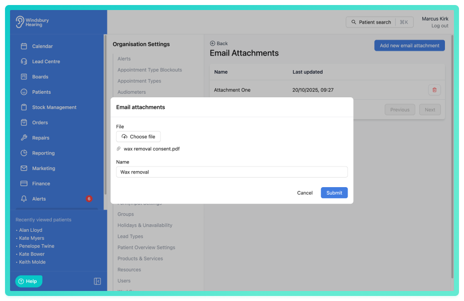 An organisation can upload documents to HearLink to be used as email attachments for email templates. Once uploaded these documents can be attached when sending an ad hoc email to a patient.