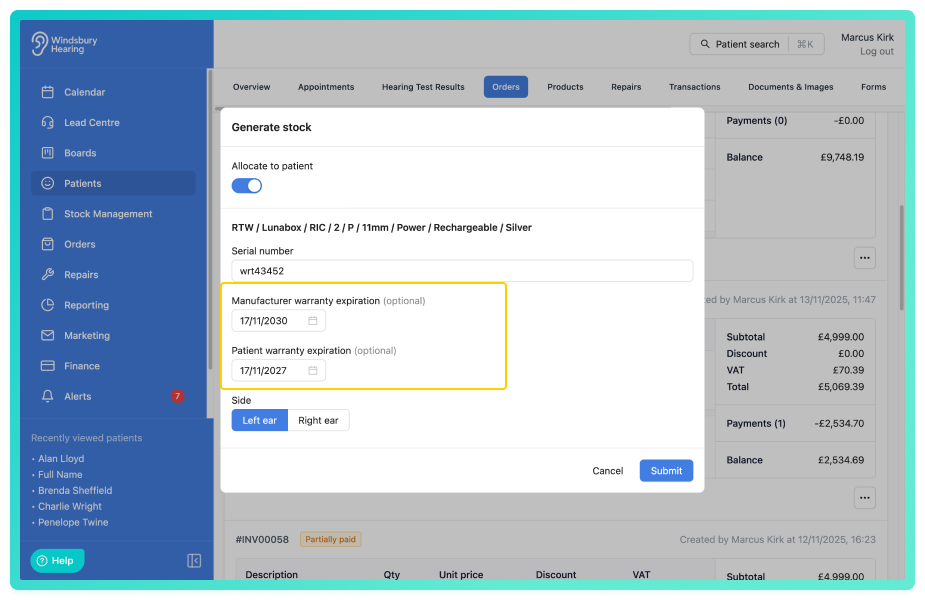 The product warranty can now be separated into Manufacturers and Patient warranty. This helps track warranty periods for patient products and existing stock.